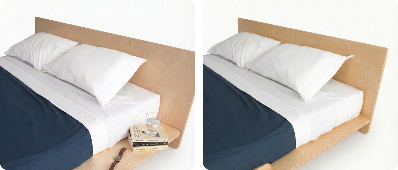 O modelo conta com uma plataforma que se projeta por todo o perímetro, criando uma moldura funcional com efeito de leveza, como se a cama estivesse suspensa.