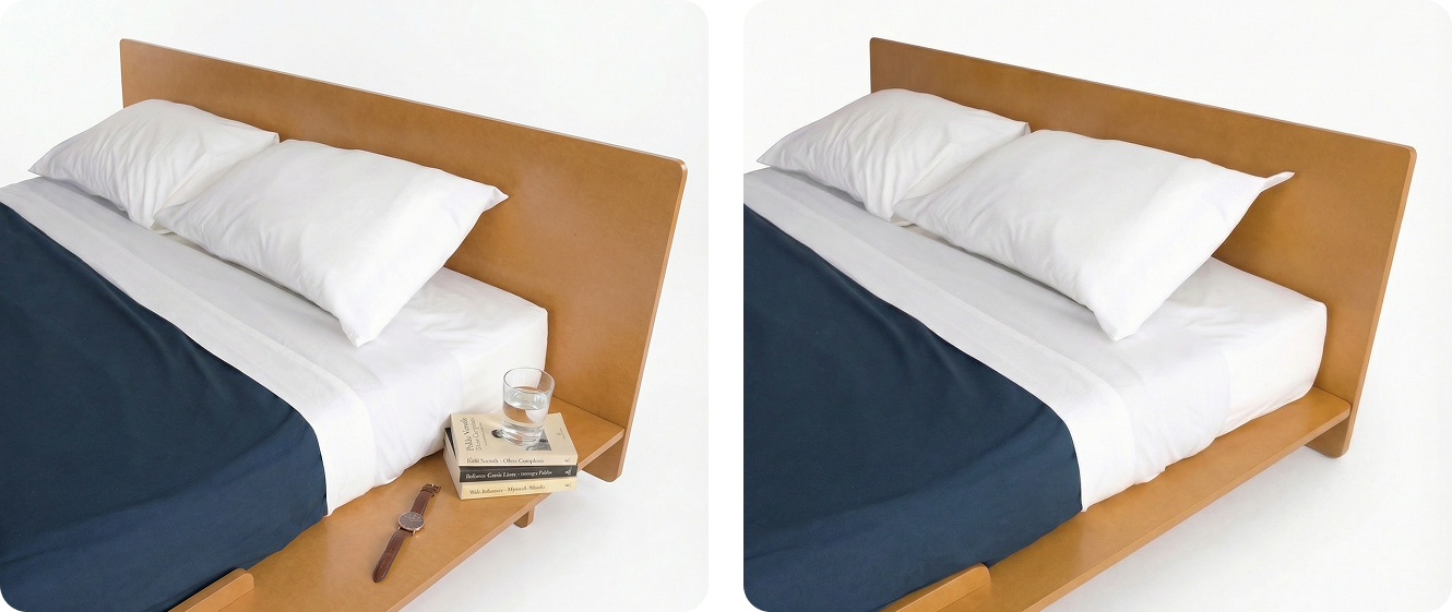 O modelo conta com uma plataforma que se projeta por todo o perímetro, criando uma moldura funcional com efeito de leveza, como se a cama estivesse suspensa.